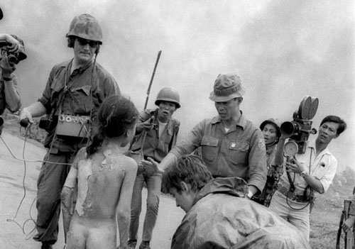 1972年6月8日,展鹏一号公路附近,遭空中汽油弹误炸烧伤的9岁女孩潘金淑被电视台工作人员和南越士兵团团围住。一架南越飞机对可疑的越共藏身目标实施空中打击,却将燃烧汽油弹投入平民村庄。