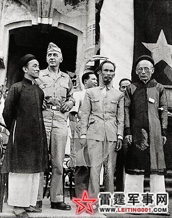 1945年10月11日,日本受降仪式在河内举行,美军中将Philip E.Gallgher也在场,他的左边就是胡志明和被废黜的前越南国王保大(Bao Dai),二战中,胡志明和美军OSS密切配合打击日军,营救美军飞行员。1945年9月2日,胡志明在越南北方的河内以临时政府的名义宣告越南民主共和国成立,并积极采取行动恢复越南的统一。胡志明幻想美军能帮助越南独立,可是理想和现实总是背道而驰的。在越南南方,一直坚持□□的吴庭艳,于1955年10月在美国的支持下,在西贡成立新的政府。