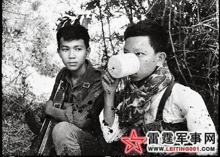 两个年纪很小的越共游击队员在西贡数英里外休息,喝水的那个眼神很肃杀啊!(1967)