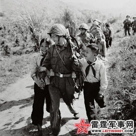 一群越南儿童跑出村子迎接一列越南人民军。这是越南人民军记者Nguyen Dinh拍摄的一副著名宣传照,他从50年代就开始摄影工作了。(1974)
