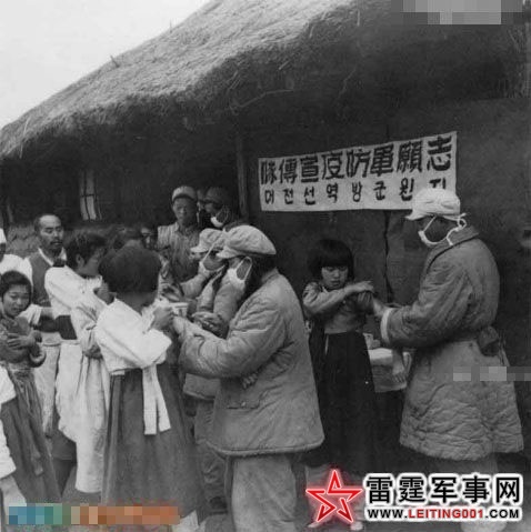 志愿军防疫人员正在为朝鲜儿童注射防疫疫苗