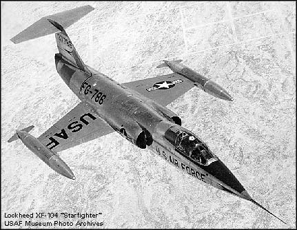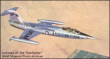 XF-104是根据1953年3月11日签定的合同研制的原型机,共有2架。由于原来计划采用的J79发动机的研制进度赶不上飞机试飞的需要,所以XF-104装备的是XJ65-W-6发动机,军用推力为3,540千克,加力推力为4,630千克。第1架(首飞时发动机还没有加力装置)和第2架原型机分别于1954年2月28日和10月5日首飞。装备1门固定式的20毫米M61“火神”6管炮,有2个外挂架。第2架原型机于1955年4月在试飞中坠毁,第1架原型机于1955年10月交付给空军,1957年7月也在试飞中坠毁。